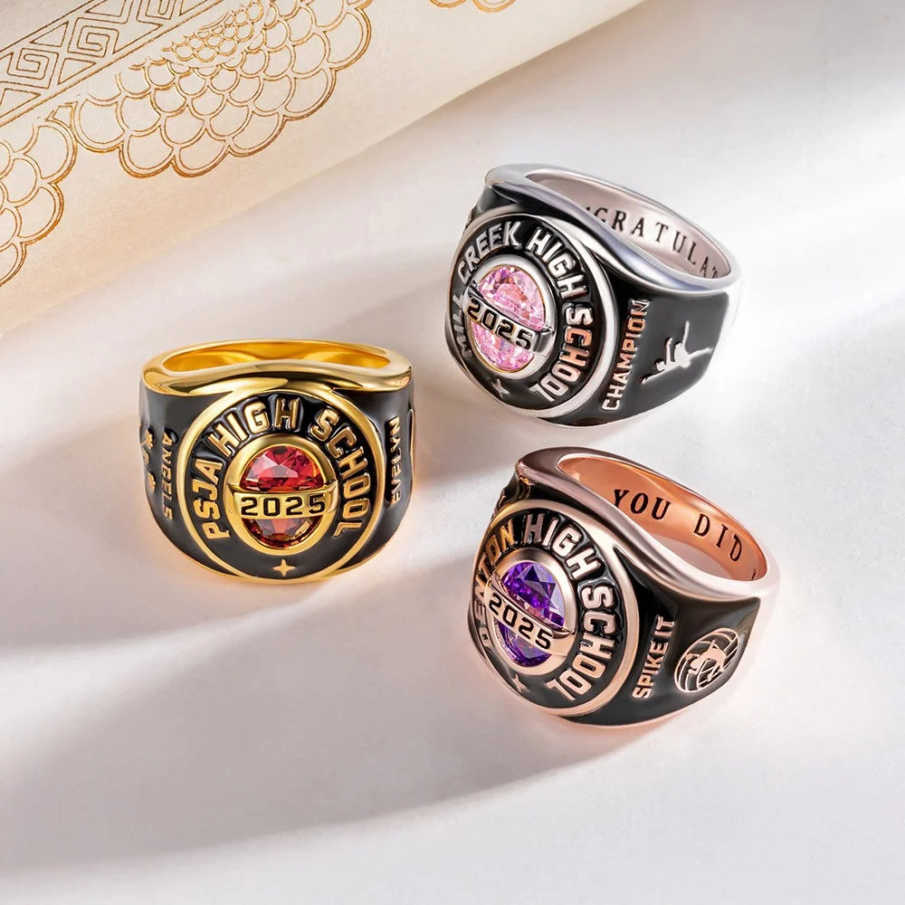 Our collection includes custom class rings with birthstones, engraved signet rings, and personalized designs that highlight school pride and personal achievement. From traditional graduation rings to more contemporary styles, each piece is designed to celebrate success.