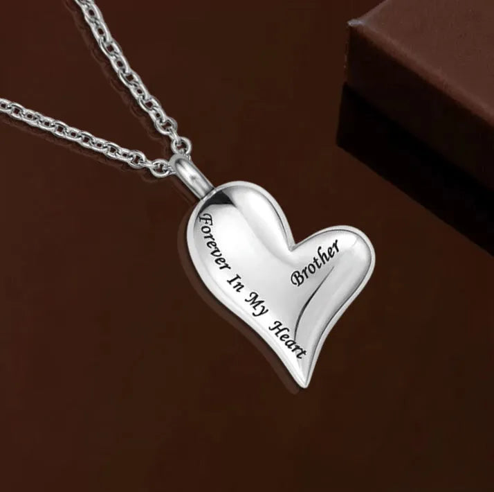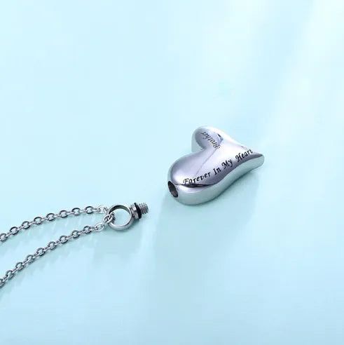Crafted from durable stainless steel, this cremation necklace features a heartfelt inscription, vividly expressing "Forever In My Heart." Its sleek and stylish design makes it perfect for everyday wear, providing comfort during difficult times.