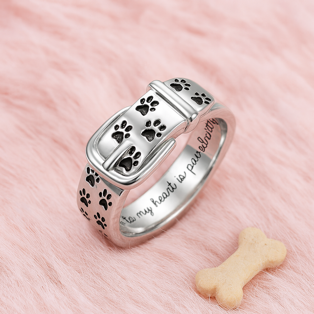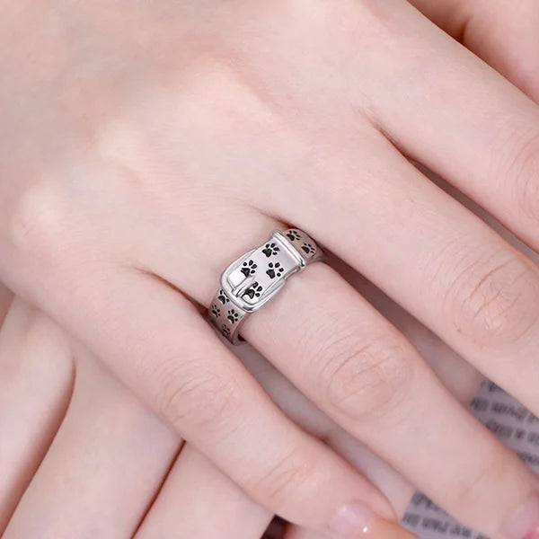 Keep your cherished pet close with this beautifully crafted paw print collar ring. Inspired by the shape of a pet collar and detailed with delicate paw prints, this ring symbolizes the love, loyalty, and unforgettable moments shared with your furry companion. Whether worn daily or kept as a remembrance piece, it serves as a heartfelt connection to your pet.